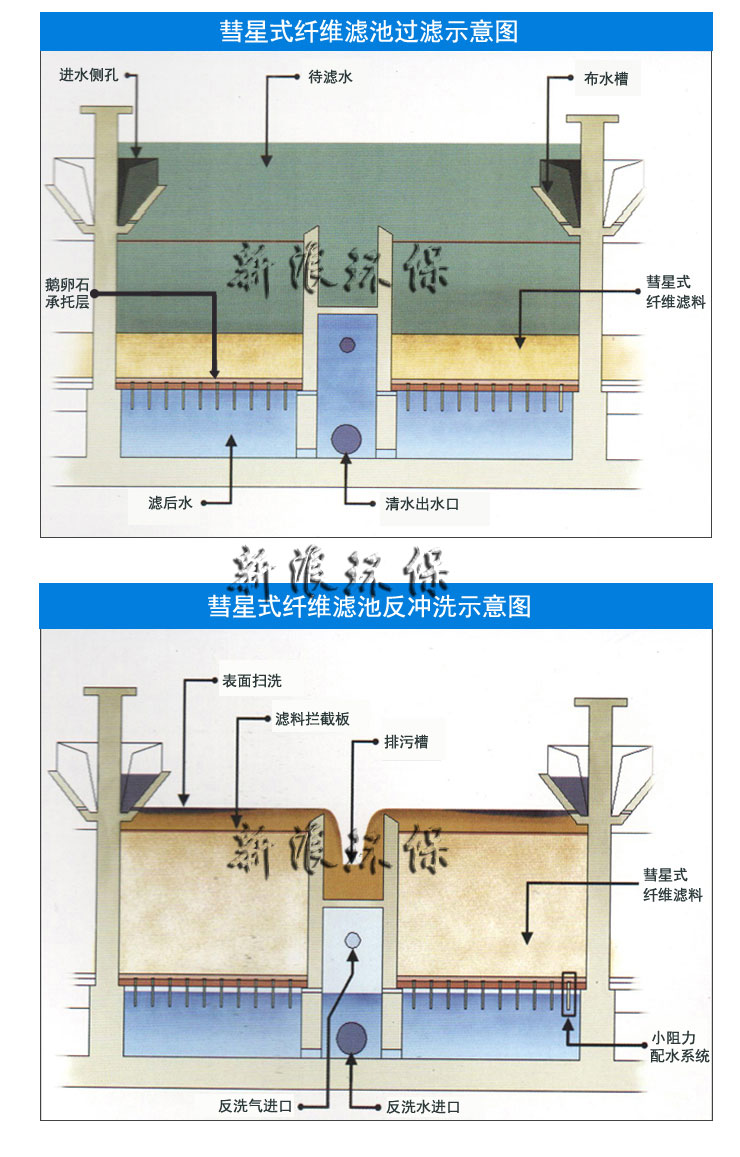 彗星式纖維濾池是一種重力式深層過(guò)濾池,它采用彗星式纖維濾料,小阻力配水布,氣水反沖,變水位或恒水位過(guò)濾方式,是目前深層過(guò)濾池中去除懸浮物較高效的過(guò)濾技術(shù)。